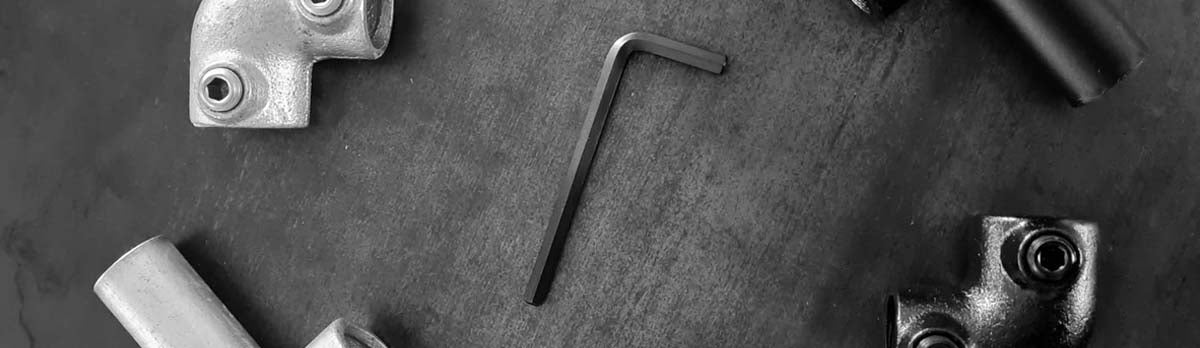 Kopplingar och rör för rörkonstruktioner | Basbeslag och flänsbeslag | T-stycke, kors och böjning | Rörövergångar och rörskarvar | Gångjärn och klämmor | Specialkopplingar, låskragar, hyllbeslag, ställningsbeslag m.m. | Varmförzinkat | Aluminium | Elektrolackerat, sort | Pulverlackerad, vintage brun